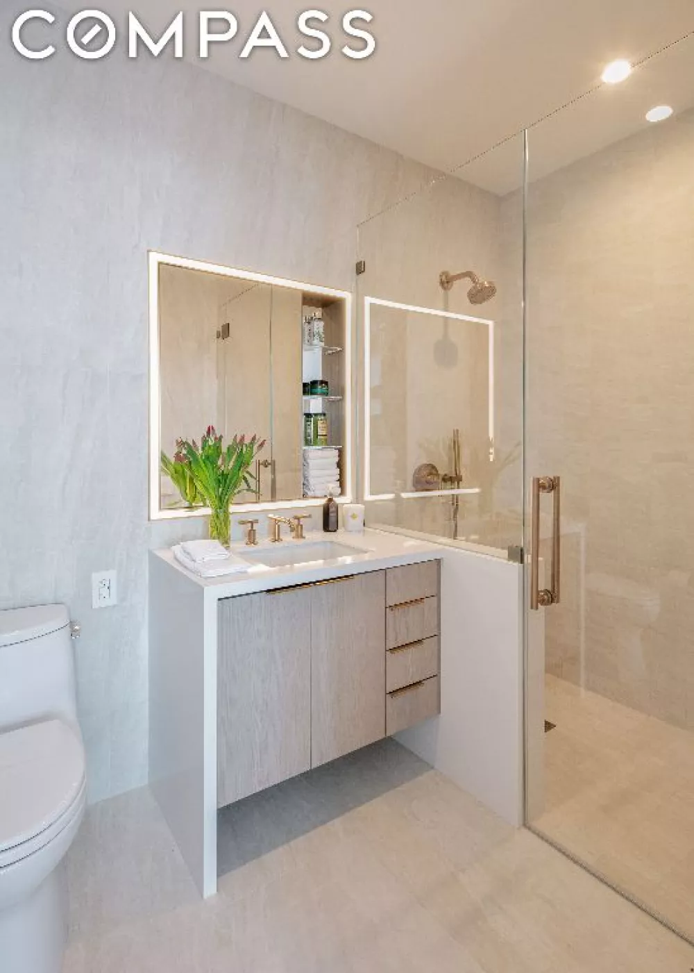 Spa-inspired primary bathroom, a luxurious private enclave. Sophisticated finishes include sand ash cabinetry with a white quartz vanity, frameless glass shower, light bronze Kohler Purist shower set, custom recessed medicine cabinet light bronze frame, with open glass shelving, surrounded with effective yet subtle warm lighting.