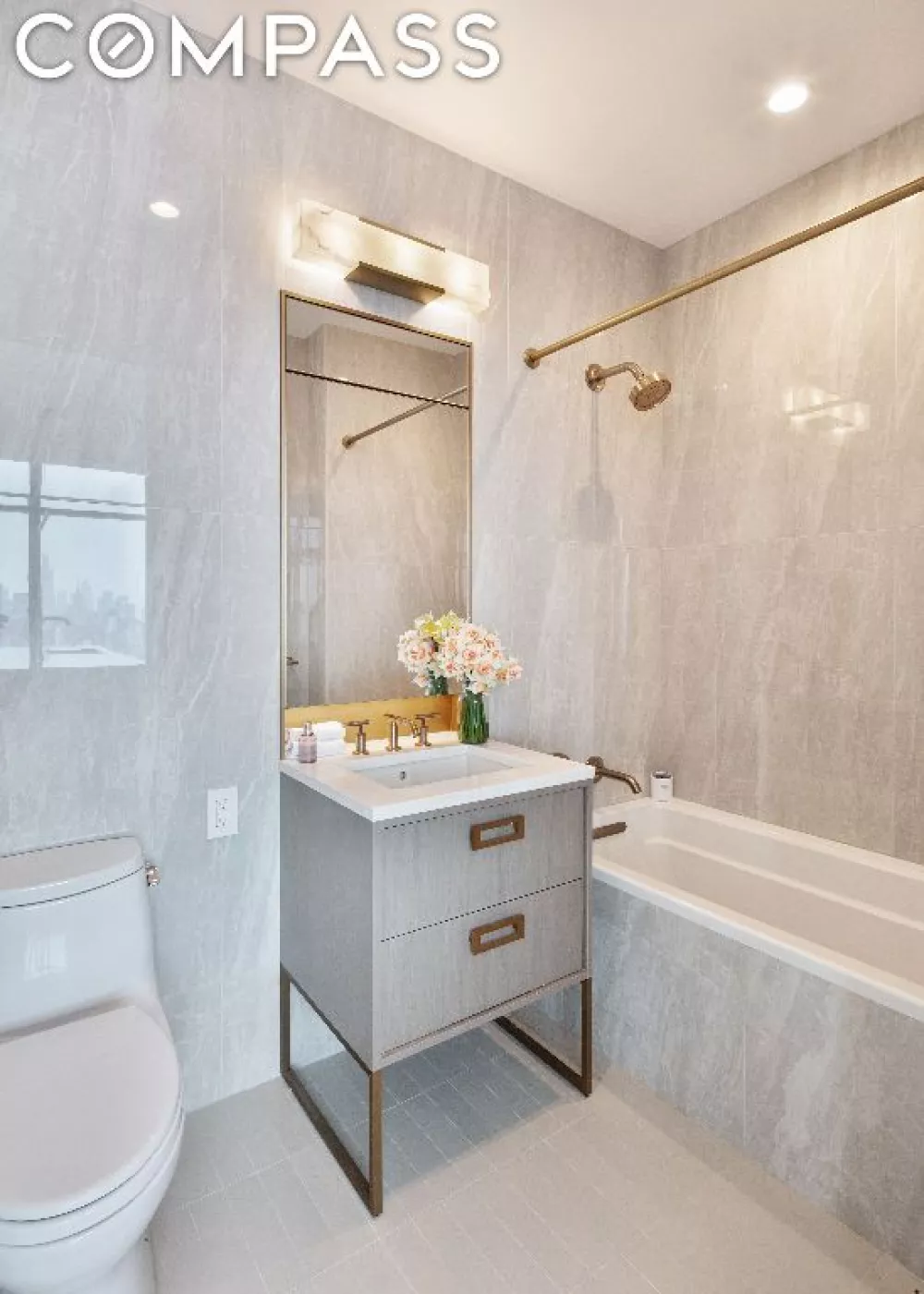 The secondary bathroom is equally luxurious. High-end finishes include grey ash cabinetry and iceberg white marble vanity, elegant wall sconces. also fitted with light bronze Kohler Purist fixtures and accessories throughout, custom recessed medicine cabinet with bronze frame and alcove, luxurious Kohler Underscore tub, Kohler Verticyl undermount sink and Toto Eco Supreme one-piece toilet.