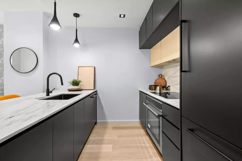 Additional highlights include recessed lighting, built-in speakers, double-pane floor-to-ceiling tilt-and-turn thermal windows, and pre-finished white oak floors with acoustic layering. Multi-zone split heating and cooling units keep interiors at desired temperatures, and custom closets and cabinetry offer convenient storage solutions. The home also comes with an in-unit washer/dryer from GE.