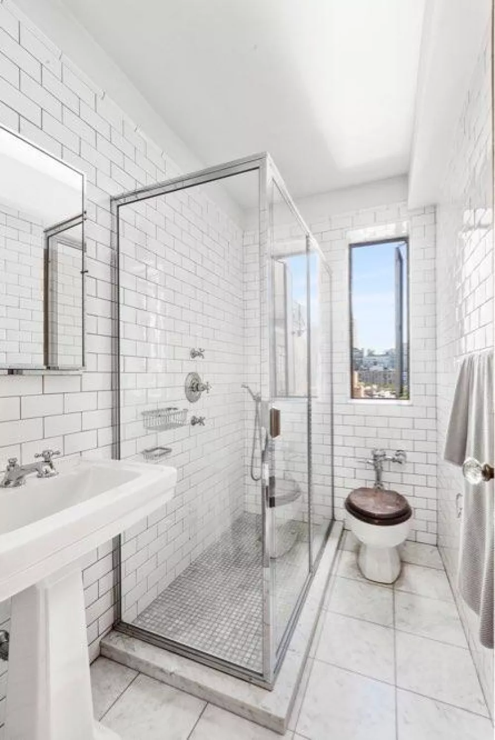 Bathroom has custom chrome framed walk-in shower with hand shower, hand cut subway tile, marble floors, pedestal sink, large marble lined Urban Archaeology medicine cabinet, Urban Archaeology ceiling fixture, timeless hand cut subway tile used in kitchen.