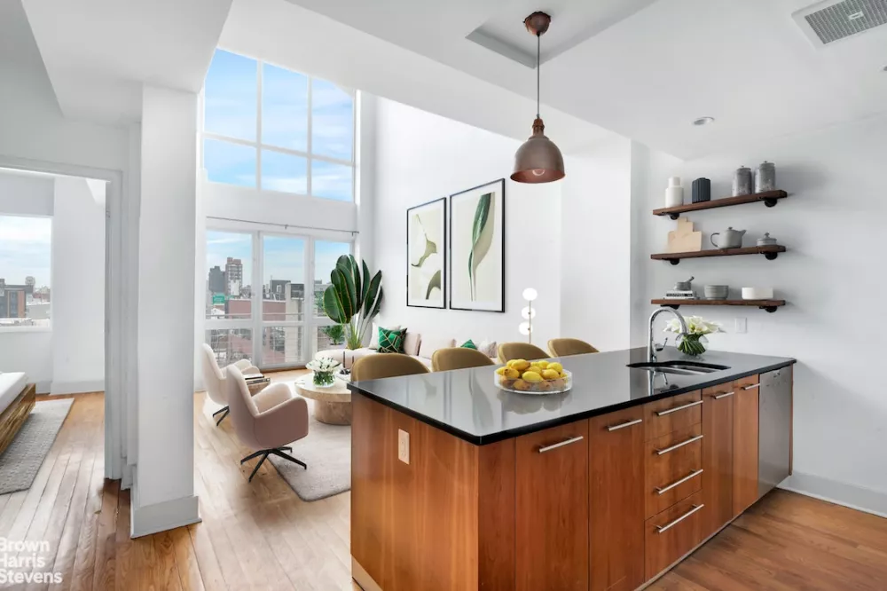 Double height living room ceiling (19.5 feet) and a corner full of windows offer amazing light throughout the day. The chef's kitchen features high-end stainless-steel appliances and ample storage. The master bedroom can fit a king-sized bed and is situated on the lower level. The upper level of the duplex can function as a guest suite or office space. Each level offers a full bathroom, and the unit includes a full-size washer/dryer.