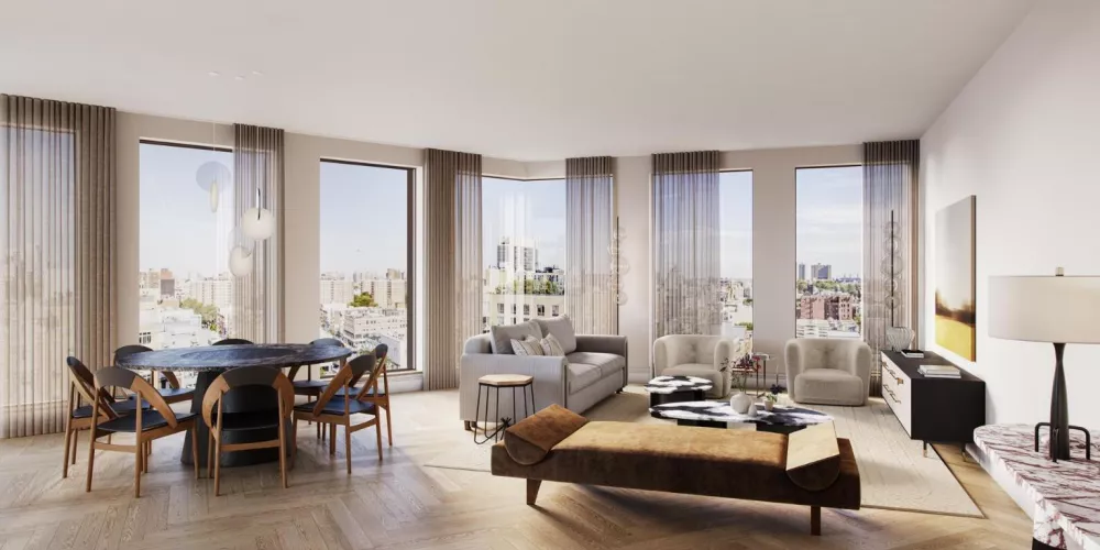 A modern reflection on timeless uptown elegance, 300 West honors the traditional architecture of Harlem with a contemporary twist. Rising fifteen stories and spanning a prime corner block in historic West Harlem, this collection of bespoke residences offers an elevated lifestyle. Complete with multiple floors of amenities including a pool and sauna, a 3,000 square foot roof deck, adjoining lounge and courtyard, and children and teen rooms, 300 West is perfectly suited for relaxation and rejuvenation. Celebrated interior designer Paris Forino brings her signature touch to the residences, balancing flow, utility, and sumptuous materials, to create spaces that project a refined calm.
