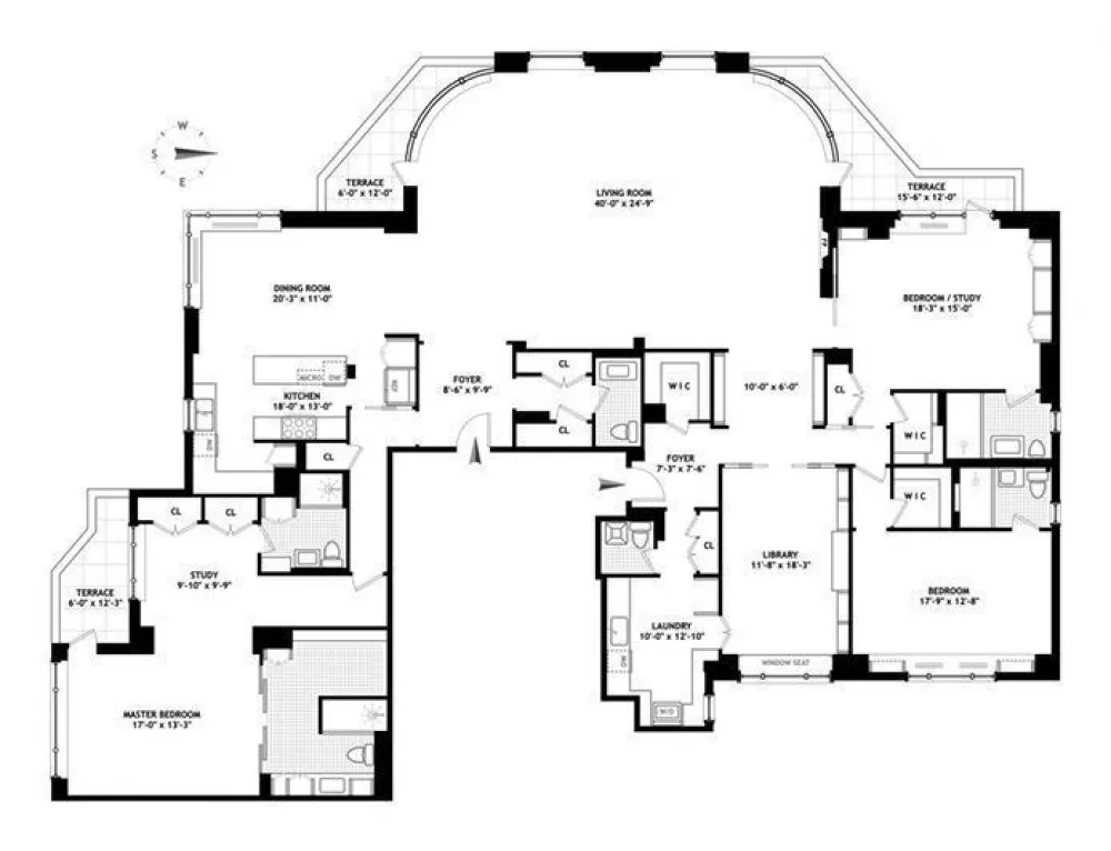 Upon entering, one is greeted by a grand living room adorned with floor-to-ceiling picture windows that showcase unparalleled vistas of Central Park to the west, Fifth Avenue to the south, and beyond to the iconic landmarks of the city. The living space, extending over 40 feet, seamlessly integrates indoor and outdoor living with two spacious terraces, ideal for entertaining or simply savoring the views.
