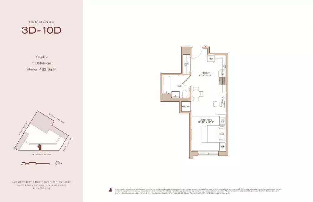 Introducing residence 4D at 300 West, an east-facing studio offering an open-concept living area that boasts custom White Oak herringbone flooring, central heating and air conditioning, and insulated oversized windows. The living area opens to a custom kitchen designed by Paris Forino, complete with White Oak cabinetry and Carrara marble countertops and backsplash. The exceptional kitchen features a Sub-Zero refrigerator, Wolf oven and gas range, and Cove dishwasher. Each apartment is equipped with a washer/dryer hook-up for convenience.