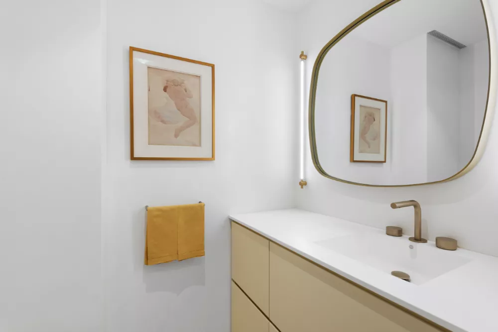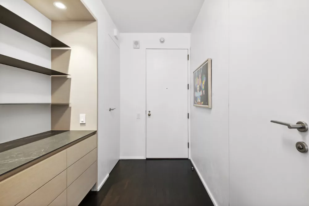 As you enter the grand foyer, you'll find a walk-in utility and coat closet on your right, and a stylish half bath on your left. A mirrored and shelved alcove offers the perfect spot to display your favorite accessories and conveniently store entry items. The corner southeast-facing living/dining room is bathed in natural light, thanks to floor-to-ceiling windows and a corner window with a glimpse of Central Park. The views offer a captivating blend of modern and old-world architecture.