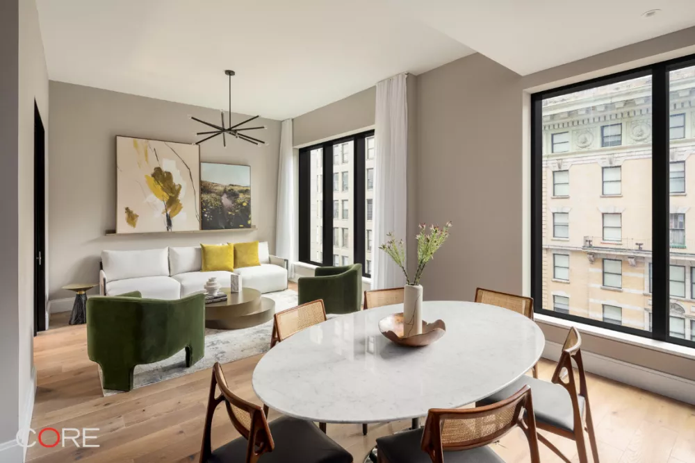 Residence 8C is a 1,355 SF two bedroom, two bath with a study. Separated by beautifully textured glass sliding pocket doors, the additional flexible space could serve as a study and is designed to adapt to changing needs and desires over time. This fantastic floor-through home offers north and south exposures. Interiors boast rusticated hardwood floors, bronze-finished hardware, and soaring ceilings up to 11 feet high with window heights of 9 feet. The open kitchen with Miele appliances features custom ultra-matte, dark charcoal woodwork, metal-framed glass upper cabinetry, and Calacatta-honed marble countertops. Anchored by a custom-designed vanity, the dramatic master bath offers brass-finished fixtures and radiant heated floors in dark, veined marble. Ample closet space and a washer/dryer complete this ideal home, which can be augmented with storage available at additional cost.