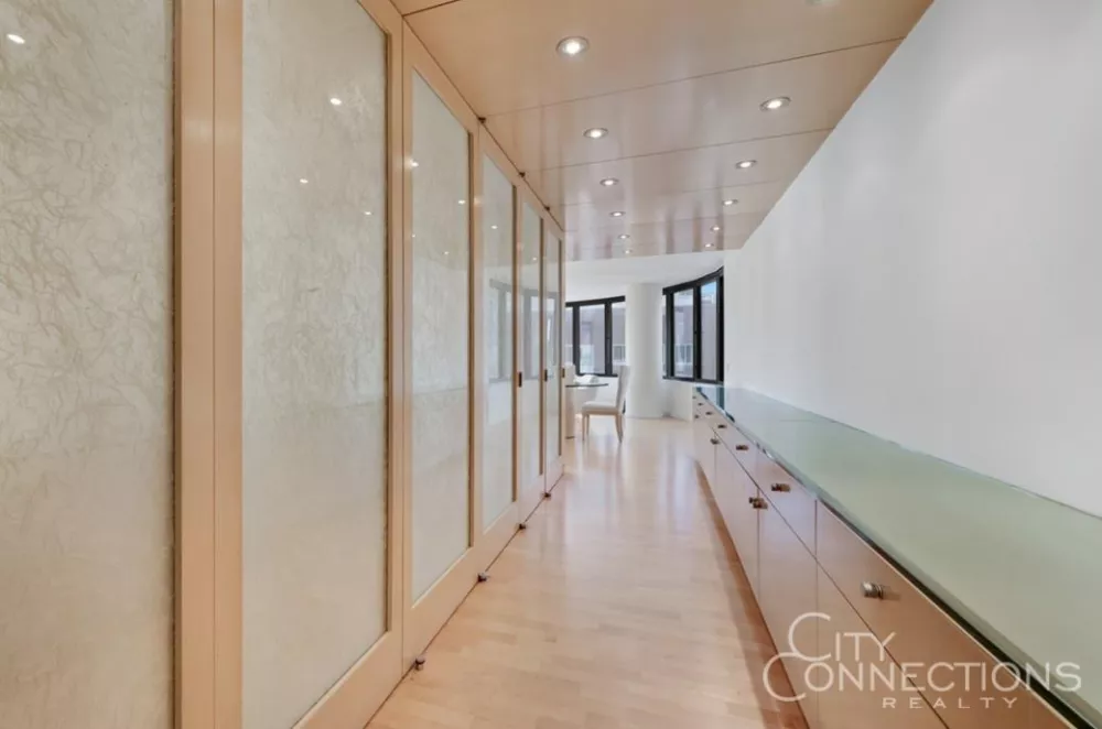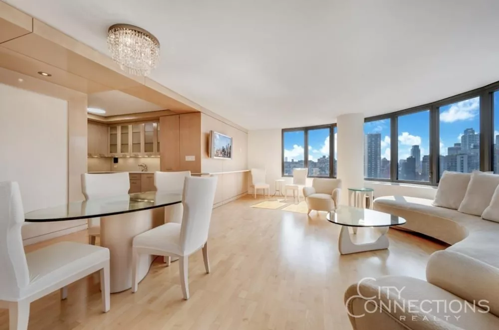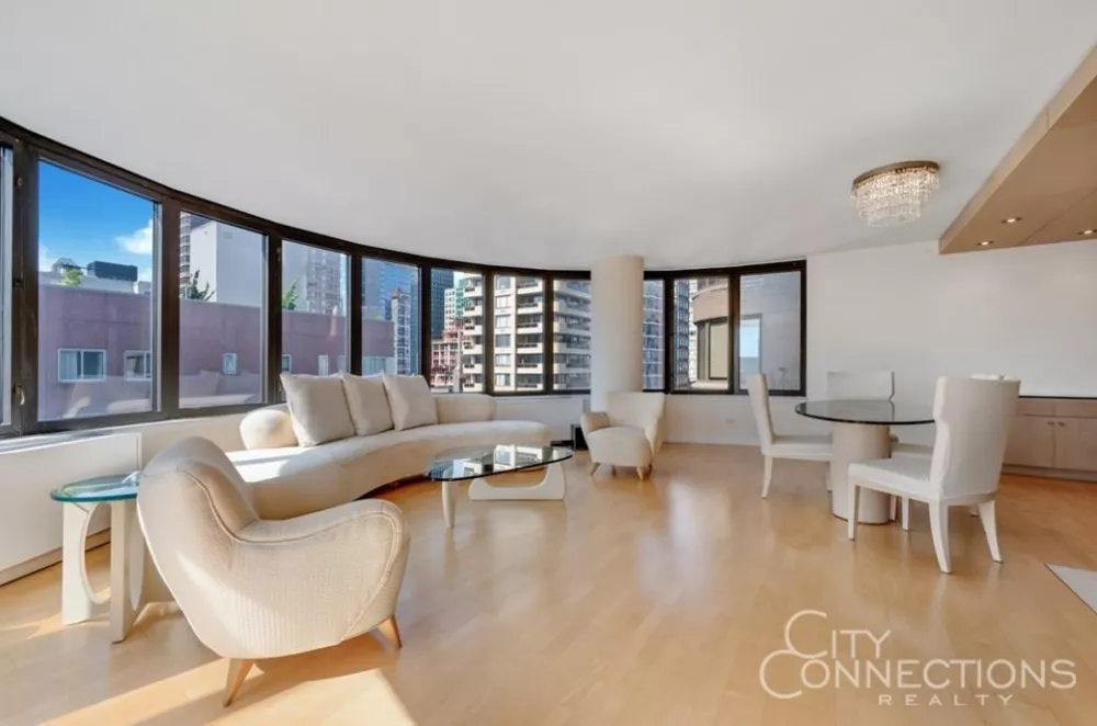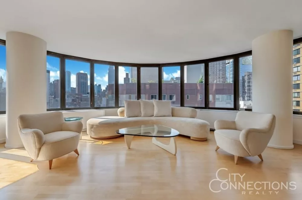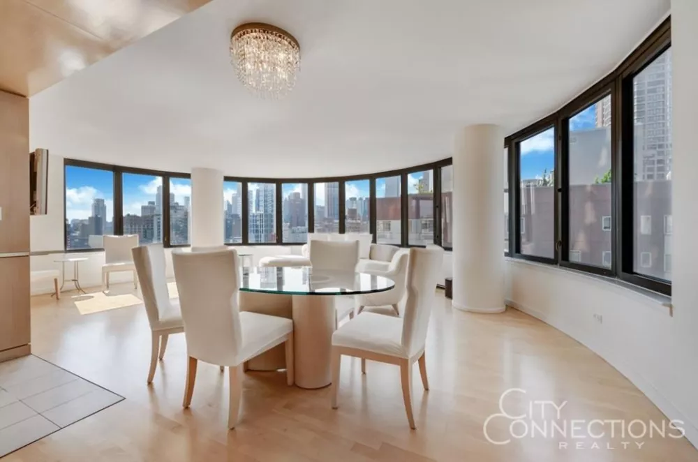 The spacious semi-circular living room is perfect for entertaining - almost 27 feet wide with 15 windows that bring in loads of light with open city views to the South and West.