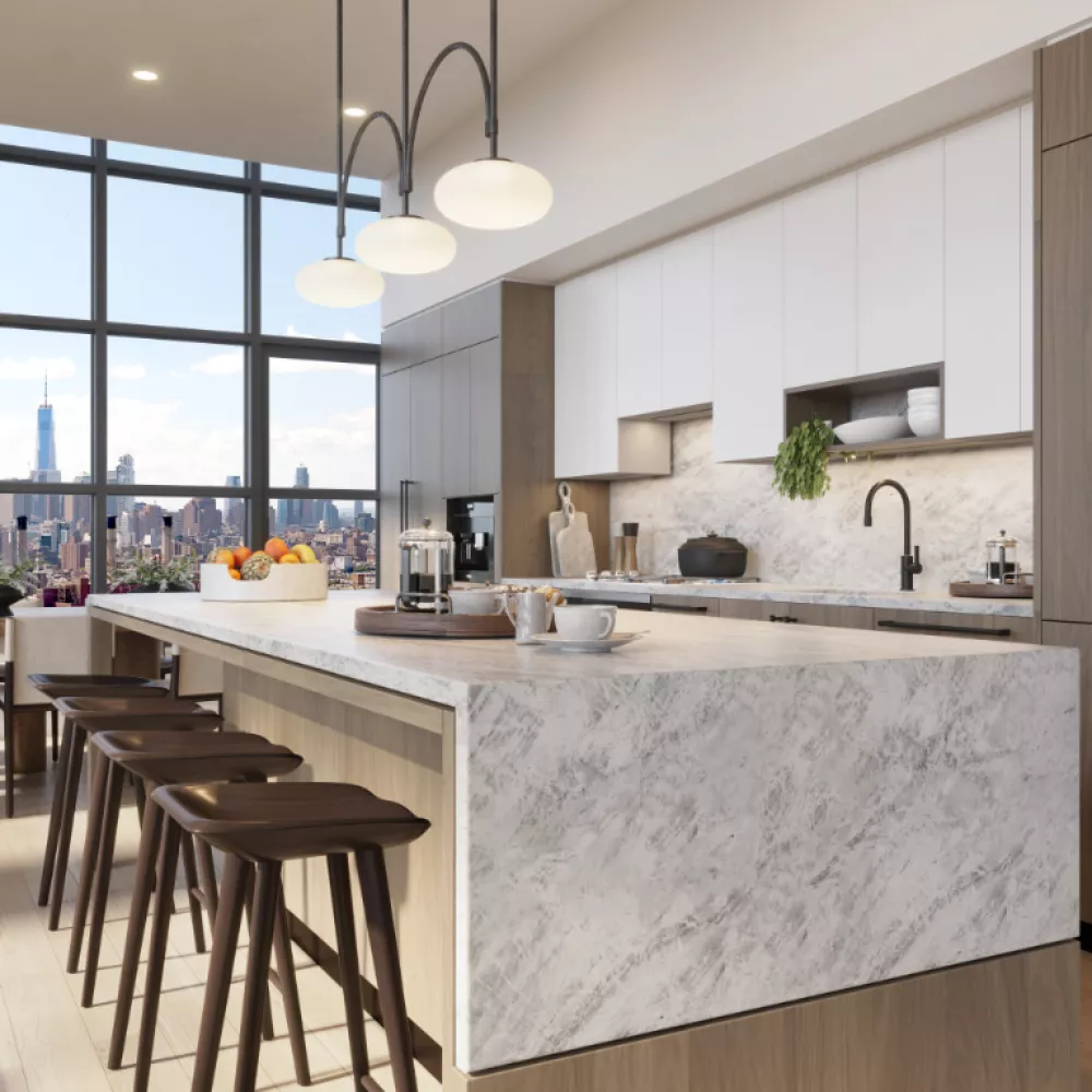 Residents at The Huron enjoy over 30,000 square feet of curated amenities and direct access to the maturing Brooklyn waterfront. Active spaces include a 50-foot indoor saltwater pool overlooking the river, a state-of-the-art fitness center with Peloton bikes, a movement/dance studio with mirrors and ballet bars and separate locker rooms with a sauna. There is a stunning resident's lounge with pool table, a formal dining room, a co-working area with pods, booths, and conference space, a game room, and a children's playroom. Outdoor spaces include a manicured waterfront promenade, an 8,000 square foot private park with recreation areas designed for kids, and two sprawling rooftops with awe-inspiring views of the iconic Manhattan skyline. Additional services include 24-hour concierge, private storage, on-site attended parking, a pet spa, a bicycle room, and a package room with cold storage.