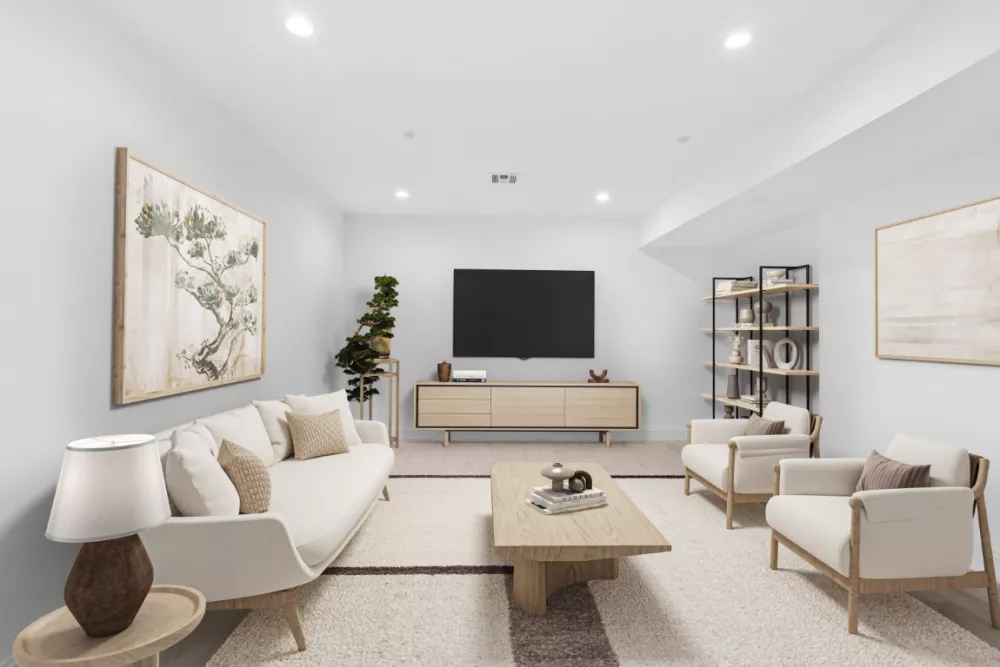 Beneath the sky, a private backyard paved in Cambridge bluestone invites gatherings, while the expansive deck offers a stage for twilight dinners under the stars. The spacious family room invites relaxation, with soft LED lighting above and ample space to gather, unwind, and create lasting memories.