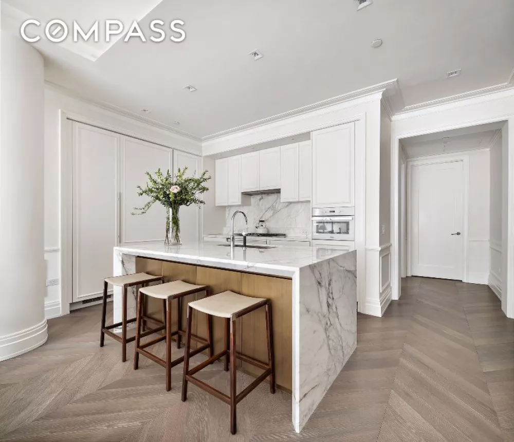 Located in the luxurious architectural masterpiece that is 108 Leonard Street, where Parisian opulence seamlessly pairs with contemporary design and modern convenience, this exceptional 1,927 three-bedroom/three-and-one-half bathroom home achieves an unprecedented level of quality and refinement. Upon arrival, a spacious foyer and gallery open to an exceptional great room with dramatic Arched windows, expansive walls for art, and ceiling heights in excess of 10'. Gorgeous wide plank gray oak flooring arranged in a chevron pattern runs throughout entertaining and transitional spaces. Custom designed by Jeffrey Beers International exclusively for 108 Leonard, Scavolini kitchen cabinetry is featured in an open plan with a Calacatta Vagli marble countertop, backsplash, and waterfall island replete with supplemental storage and ideal for both every day and occasional entertaining. Generously proportioned, the kitchen is outfitted with premium Miele appliances including a 5 -burner gas cooktop with vented hood, combi steam/convection oven, electric speed oven and wine refrigerator. A distinct entry vestibule creates a sense of privacy and seclusion in a Master Suite with large windows, a walk-in closet and a luxurious en suite bathroom with high-honed Calacatta Mandria marble floors and walls. Fantini polished chrome fixtures compliment the custom vanity and an oversized walk-in shower. Two secondary bedrooms with en suite bath, a signature powder room with sculptural Nero Marquina marble sink and a utility closet with washer and dryer complete this singular offering. Available furnished or unfurnished, this home is resplendent with bespoke details lending both a unique style and luxurious design featuring Stark carpeting in the two guest bedrooms, blackout shades and drapes, California Closet build-outs in all seven closets, a custom built-in bar in the dining area, and stunning light fixtures throughout including Murano glass chandeliers in the living area. A deeded private storage locker is included as well. 108 Leonard offers multiple attended lobbies, a discreet drive in motor reception with private valet parking and over 20,000 square feet of wellness driven amenities built for entertaining, repose and revitalization including a fitness center, lap pool, chef’s kitchen with dining room and wine vault, children’s playroom, lounge, and roof terrace with cabanas and yoga platform. Award-winning hospitality design firm Jeffrey Beers International has scrupulously restored renowned architect McKim Mead & White’s Italian Renaissance Revival landmark; masterfully imbuing a distinctly contemporary yet timeless point of view within Tribeca’s most iconic century-old building.