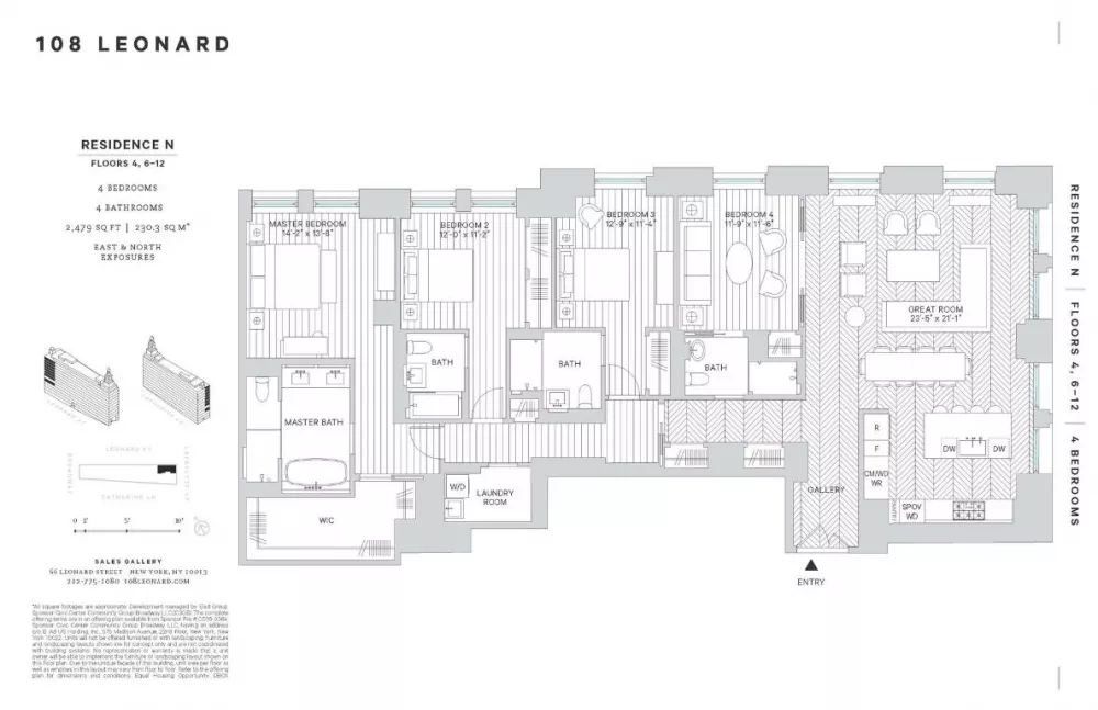 This 2,487 square foot 4-bedroom, 4 bath residence features uncompromised scale, volume and character. Upon arrival, a private gallery proceeds to an exceptional corner great room with dramatic windows and ceiling heights in excess of 9'. Gorgeous wide plank blond oak flooring arranged in a chevron pattern runs throughout entertaining and transitional spaces. Custom designed by Jeffrey Beers International exclusively for 108 Leonard, Scavolini kitchen cabinetry is featured in an open plan with a Calacatta Vagli marble countertop, backsplash, and waterfall island replete with supplemental storage and ideal for both every day and occasional entertaining. Generously proportioned, the kitchen is outfitted with premium Miele appliances including a 5 -burner gas cooktop with vented hood, combi steam/convection oven, coffee station, electric speed oven and wine refrigerator.