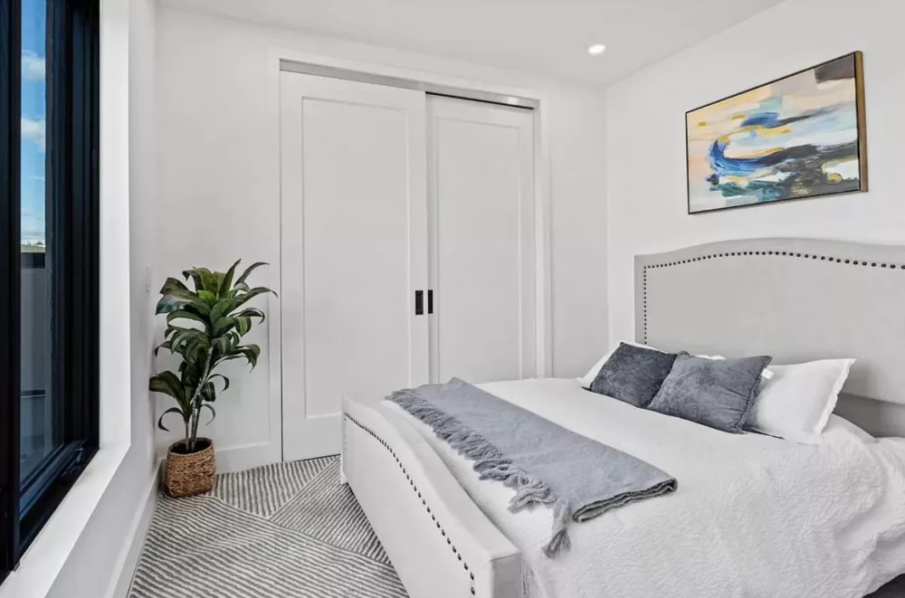 Bedroom is on the upper level for the utmost privacy. The primary suite has direct access to a a rooftop terrace. It also has a reach-in closet and a windowed en-suite spa bathroom with gray porcelain tile floors, ribbon maple tile walls, a custom Fine Fixture vanity, an LED-lit vanity mirror, matte black Artos fixtures, an Icera toilet, and a walk-in rain shower with pebble stone floors.