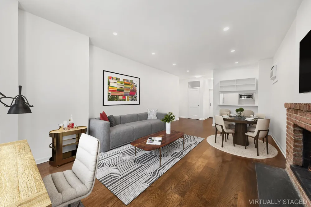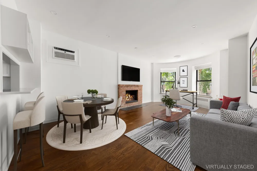 This home is rich with pre-war details, offering hardwood floors, charming brick fireplace, 9'4" ceilings, through-wall air conditioning, and an essential Brand-NewWasher/Dryer.