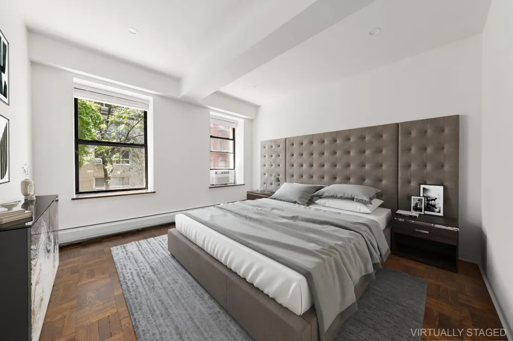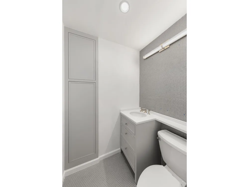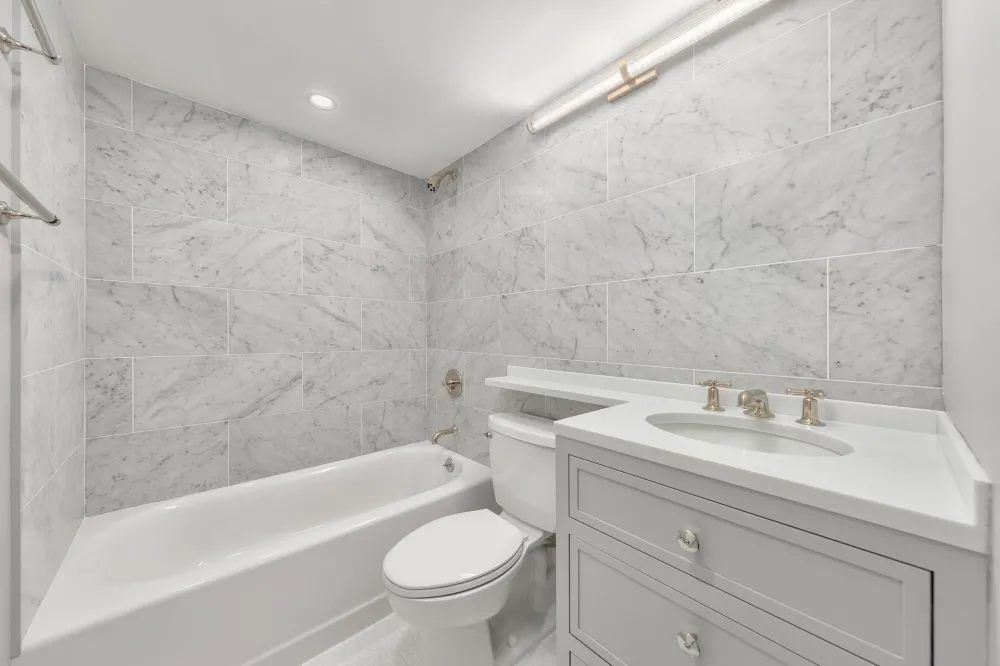 The spacious bedroom boasts a walk-in closet that will delight any fashionista. Both the primary and half bath are newly renovated No expense was spared in both bathrooms from Waterworks materials and fixtures. Carrara white and gray marble envelopes the walls while the floor is drenched in a classic, New York-style white penny tile. Medicine chests and a three-drawer vanity are both custom and offer excellent storage space. Elegant, brushed nickel hardware from Waterworks in the tub/shower/sink/faucet offer the finishing elegant touch to this private space. Wall sconces by Visual Comfort as well as recessed lighting allow both aesthetically pleasing design.