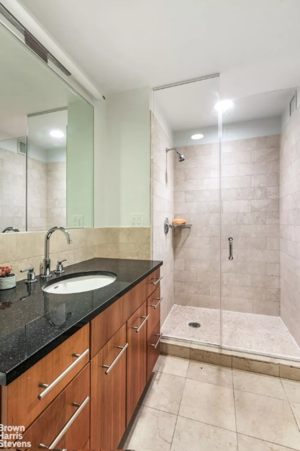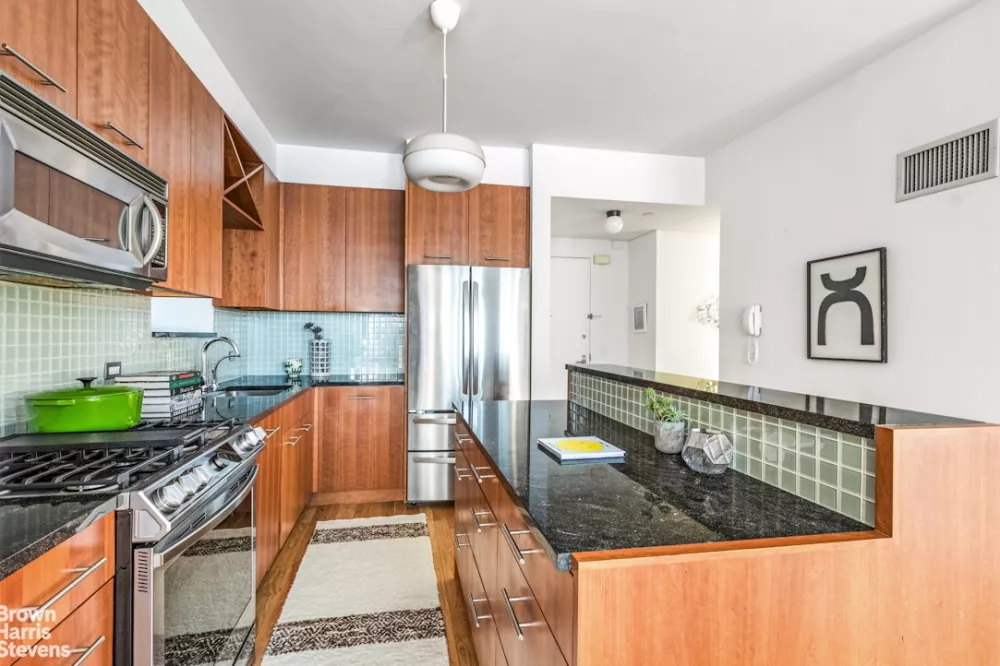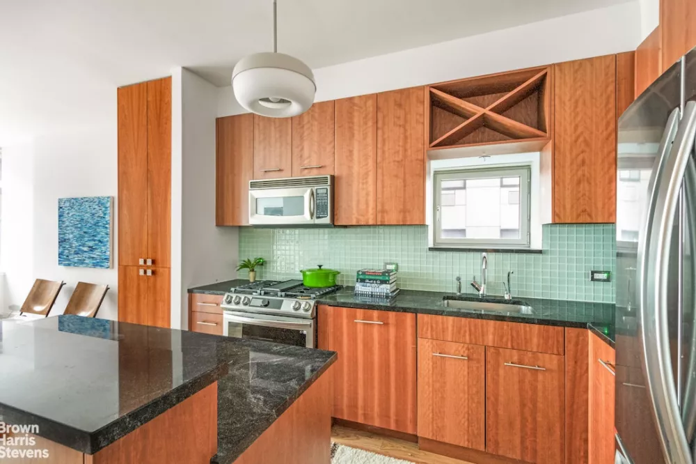 Prime NoMad two-bedroom home features north, south, east and west exposures and pleasant sunlight throughout the day. The gracious 1,374 SF layout features split bedrooms and a sprawling entertaining space of over 20' x 30'. The 9' ceilings and wall-to-wall windows provide a grand sense of space and light. Adjacent to the living and dining room is a gourmet open chef's kitchen with a window. This features sleek granite counters, solid wood cabinetry, glass tile backsplash and stainless steel appliances. The center island provides extra prep space and storage as well as additional seating.
