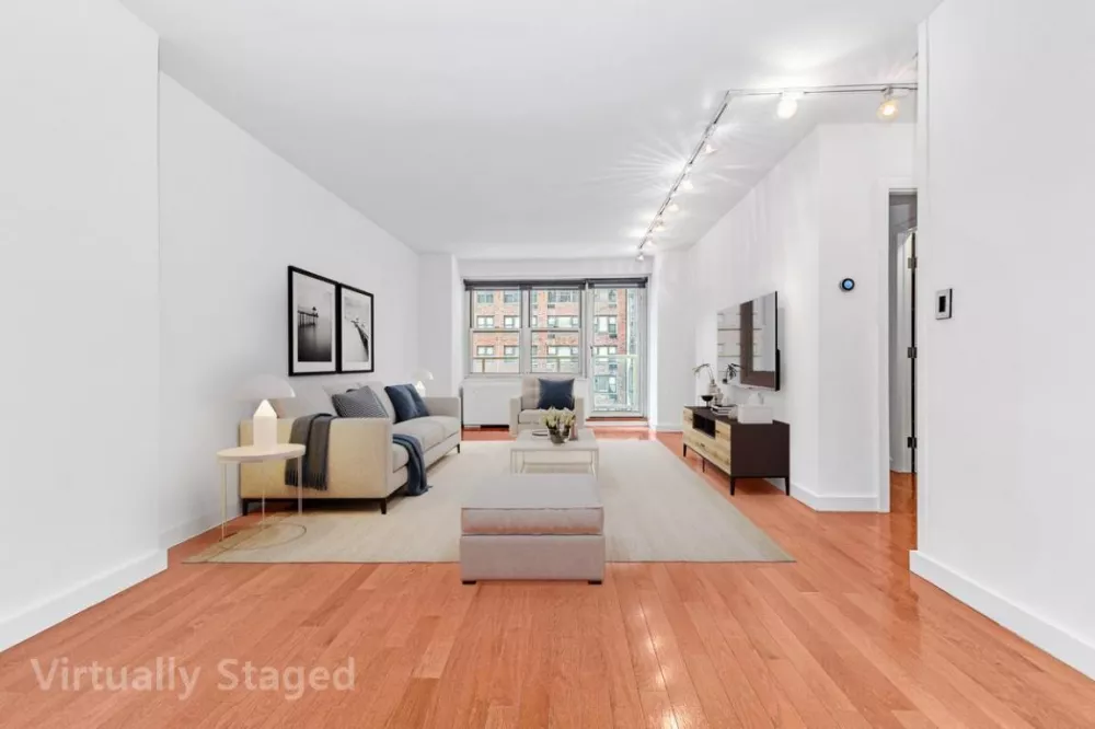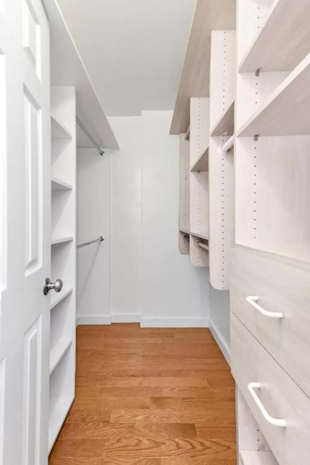 There is a suite of custom closets in the gracious entryway, and custom lighting and hardwood floors throughout, including modern tracklighting, providing additional light to the apartment’s western natural sunlight.