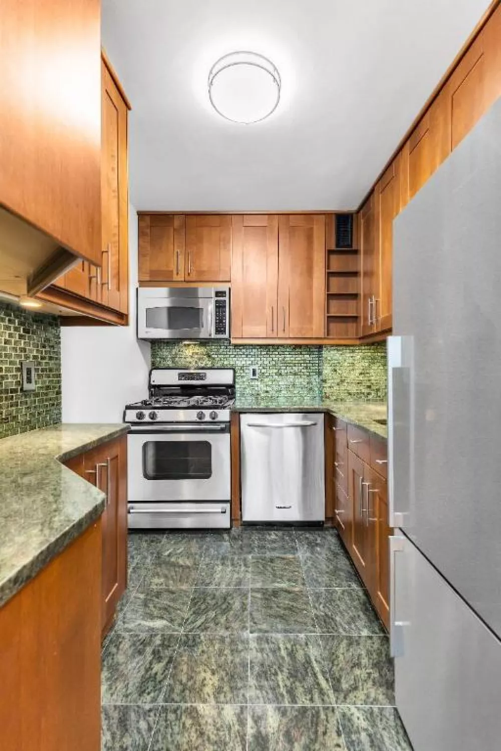 This large one-bedroom features a renovated kitchen with stainless steel appliances including Fisher and Paykel full size refrigerator, full size dishwasher, crafted cabinets, tile backsplash and granite countertops.