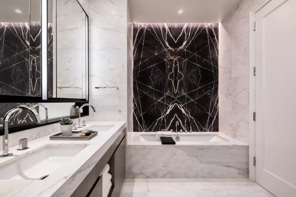 A distinct entry vestibule creates a sense of privacy and seclusion in a Primary Suite with large windows, a walk-in closet and a luxurious en suite bathroom with high-honed Calacatta Mandria marble floors and walls. Fantini polished chrome fixtures compliment the custom vanity and an oversized walk-in shower. Two secondary bedroom with en suite bath, a signature powder room with sculptural Nero Marquina marble sink and a utility closet with washer and dryer complete this singular offering.