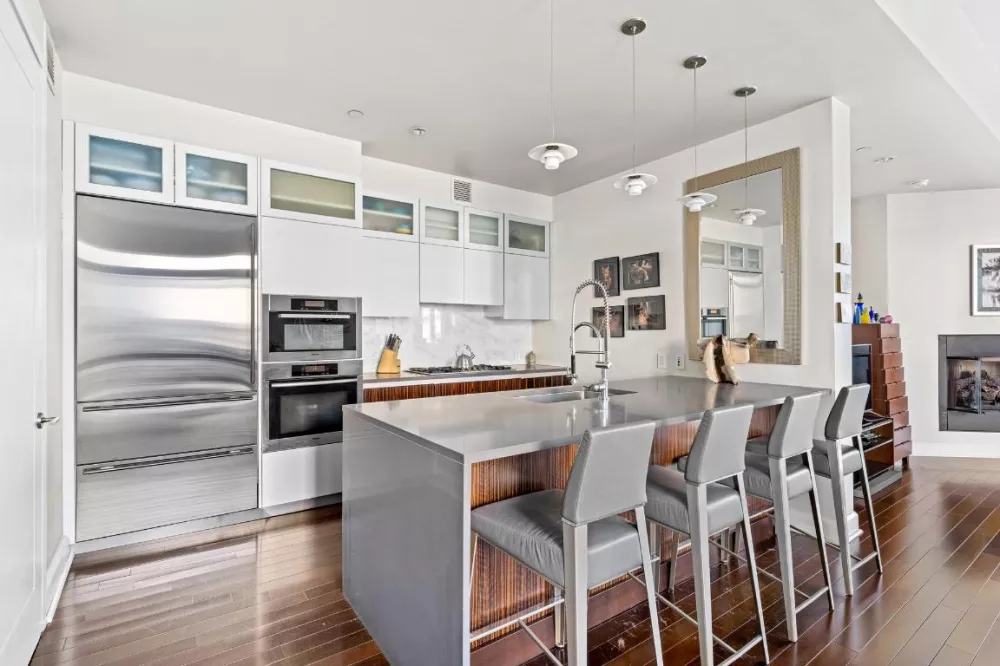 One enters a proper foyer, leading to an enormous great room, floor-to-ceiling windows, 11" ceilings, handsome gas powered fireplace, and an incredible custom designed open chef's kitchen replete with Caesarstone countertops and dining bar, loads of storage, and appliances by Miele, Gaggenau, Sub Zero, and Bosch. The kitchen is also complemented by a large walk-in pantry and wine chiller.
