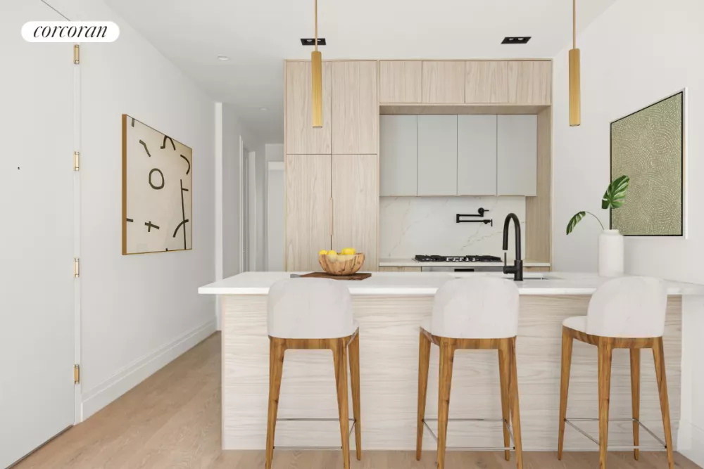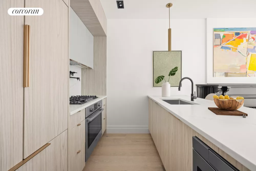Upon entering the expansive living room, you''''ll be greeted by a spacious living room with dining alcove, complemented by an original fireplace that exudes timeless elegance. Wide plank oak flooring speak to the natural aesthetic, while the sleek galley kitchen is outfitted with top-of-the-line appliances, including a paneled Fisher & Paykel refrigerator, Bosch five-burner gas stove, built-in drawer microwave, and dishwasher-all seamlessly integrated into the kitchen''''s refined design.