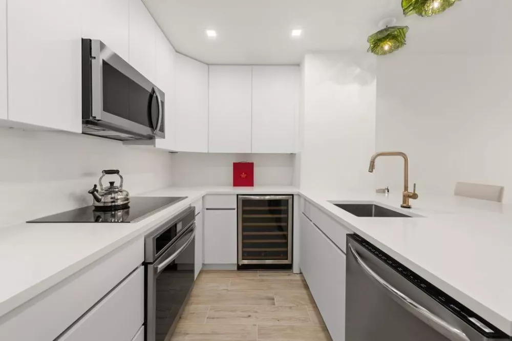 The large open professional kitchen, facing Fifth Avenue, is equipped with brand-new appliances and includes a separate closet with a washer and dryer, combining functionality with elegance.