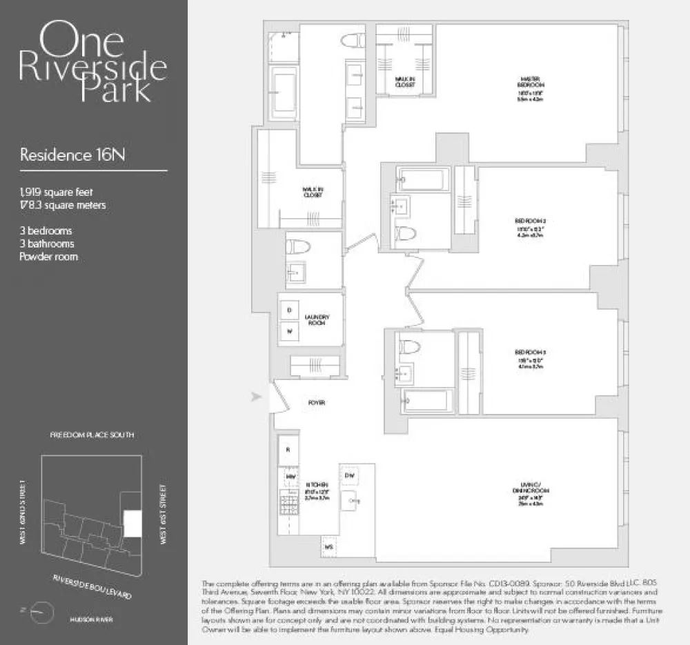 This loft like home in Lincoln Square has 9',6" foot ceilings and low carrying costs due to a generous Tax Abatement through 2037. Double Height floor to ceiling windows are an added bonus. The nearly thirty foot living room is also thirteen feet wide offering extraordinary comfort and multiple furnishing opportunities. Three KING sized bedrooms, three and a half baths – nearly 2000 square feet — and ALL rooms face the RIVER! Twenty year Real estate tax abatement through 2035 means total carrying costs $2400 per month. This spectacular home is the ONLY Three Bedroom for sale at One Riverside Park that has RIVER VIEWS and offers a unique opportunity to own an investment for now and the future. Large storage unit transfers with this unit. Check out the stunning layout in the newly added floor plan!