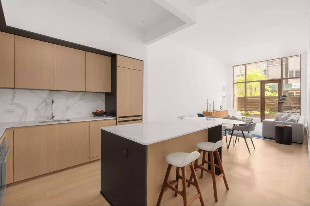 Designed for entertaining, 1D features an open kitchen with modern, custom Italian cabinetry by Canova and integrated Wolf and Sub-Zero appliances. A 26" x nearly 13" great room leads to a private terrace finished in ipe wood decking with a built-in planter box running the full length of the terrace. The terrace is equipped with everything you need to create a year-round outdoor oasis, including drip irrigation, hose bib, and custom lighting. Privacy abounds with seasonal trees and plantings selected by landscape architect M. Paul Friedberg surrounding the entire terrace.