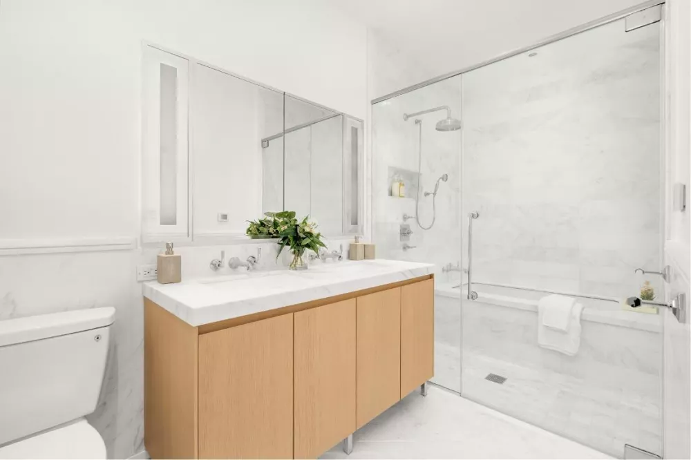 The primary bedroom suite includes a large walk-in closet and a five-fixture bath with radiant-heated marble floors, a Duravit soaking tub, a glass-enclosed shower, Lefroy Brooks fixtures, and a double vanity with exceptional storage.