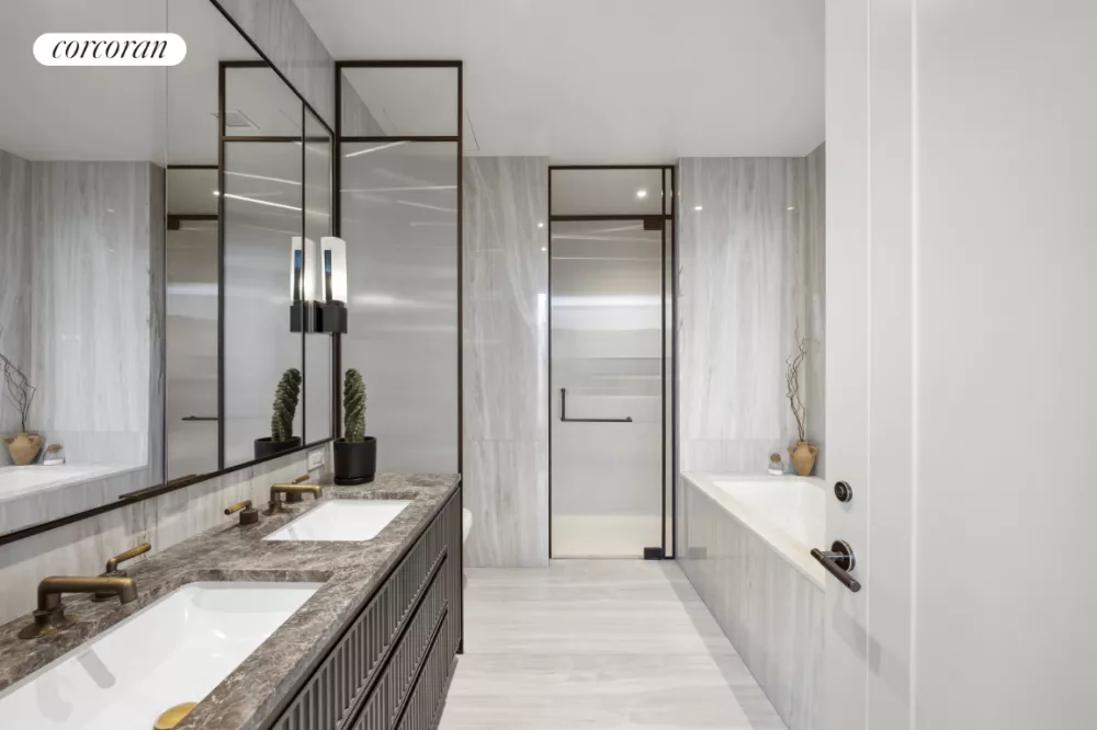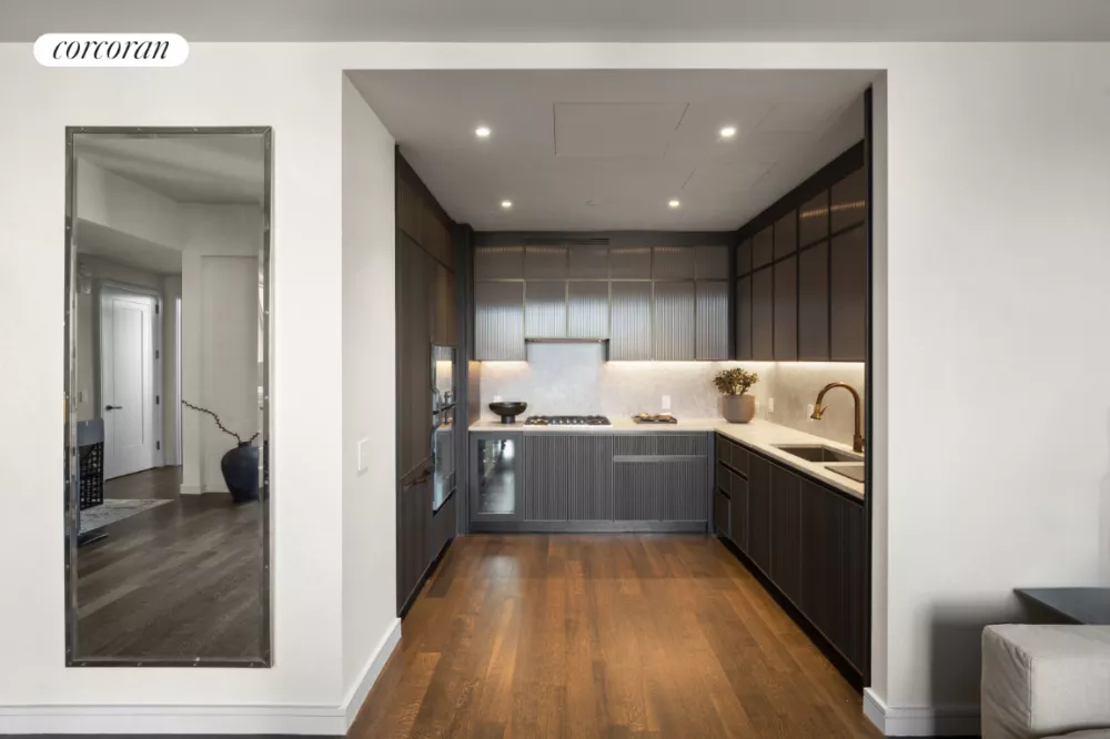 The entrance opens to a generous foyer leading into an oversized Great Room, ideal for entertaining or relaxing. The custom March and White kitchen features bronze trim, Gaggenau appliances, Calacatta Venato marble countertops, and 5-inch French oak floors. Additional amenities include an in-residence washer and dryer and ceiling heights up to 10'9".