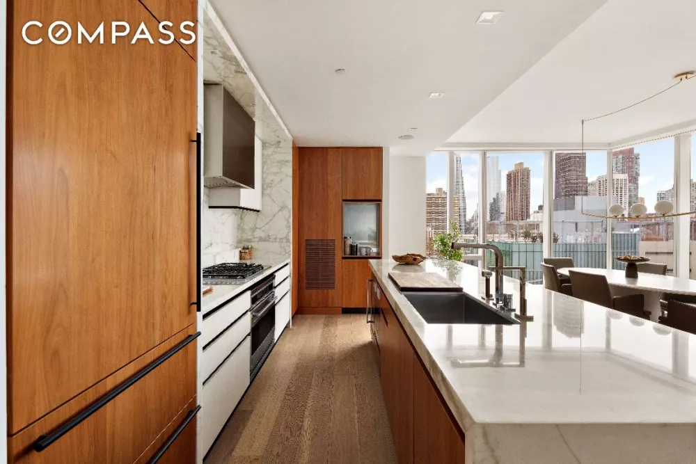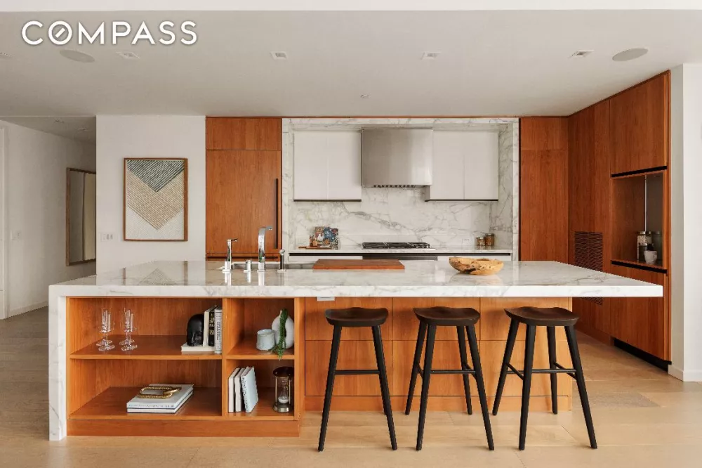The Scavolini kitchen, designed by Jeffery Beers, boasts walnut cabinets, Vagli Fine Vein marble, and top-tier appliances including Wolf, Sub-Zero, and Miele. The primary suite offers a serene retreat with a five-fixture bathroom adorned with Bianco Dolomiti marble and Dornbracht fixtures.