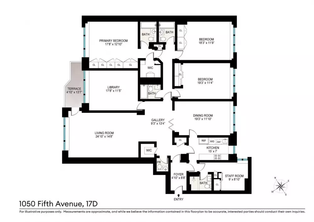 Three of the bedrooms sit in their own private wing. The Park facing primary bedroom suite has its own marble bathroom and a wall of custom closets. The two additional eastern facing bedrooms each have their own bathroom, oversized closets, as well as sunny and quiet eastern city views.