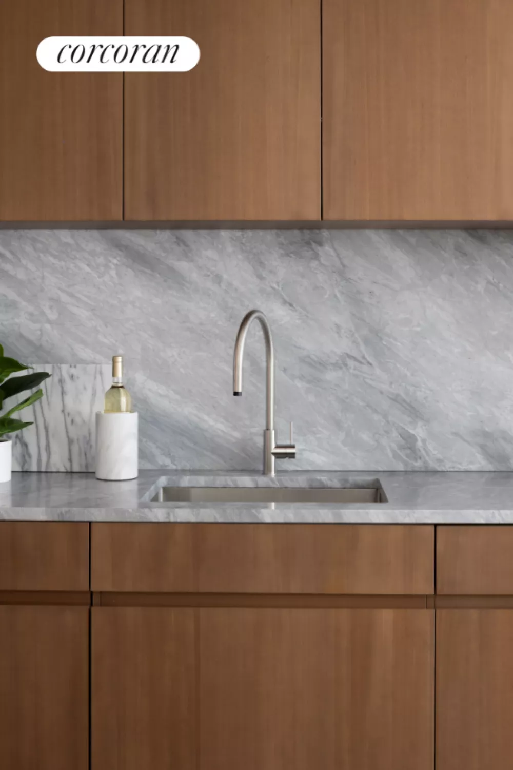 The open concept kitchen features top-of-the-line stainless steel Gaggenau appliances including: refrigerator and freezer, gas range, dishwasher and speed oven, complement Italian walnut cabinetry, honed Grigio Nicola marble countertops and slab backsplash. The spacious primary bedroom boasts a dressing area and a 3-fixture bathroom including radiant heated floors, honed tundra gray marble countertop and custom lighting designed by Sheppard.