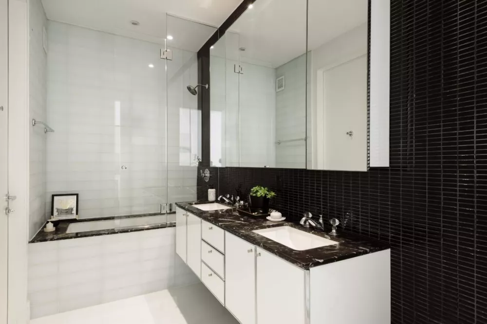 The spacious bedroom effortlessly accommodates a king-sized bed. The en-suit bathroom is a luxurious retreat, striking double sink vanity, with Chinchilla Mink marble countertops, adorned with elegant Waterworks crystal fittings. It also includes Italian glass tiles and a deep soaking tub. Offering a tranquil space to unwind. Enjoy the convenience of an in-residence washer and dryer, making everyday tasks a breeze. Residence finishes may vary. Images are representative.