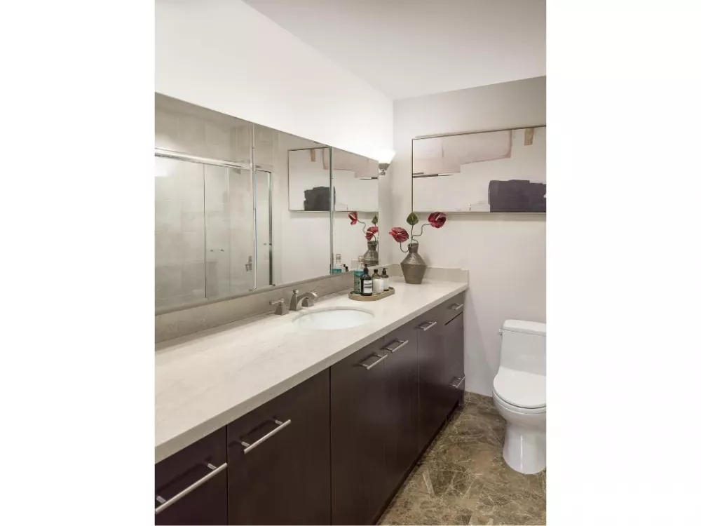 Upon entering the residence, you are greeted by a large foyer, from which you can access the perfectly appointed kitchen, in-unit laundry, or the main living/dining spaces and/or separate bedroom wing. Two full bathrooms, adorned with marble floors and counters provide flexibility for your guests and privacy for you. Multiple closets, as well as two custom-designed built-in systems made of Italian mahogany offer substantial storage throughout the space.