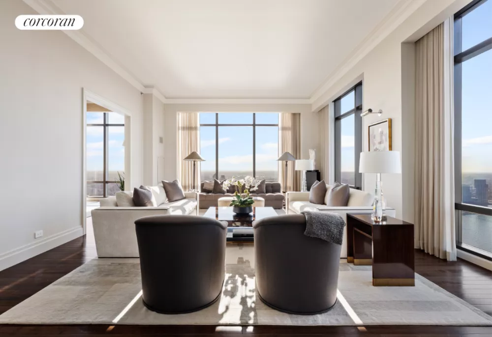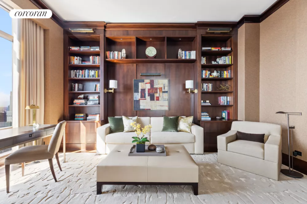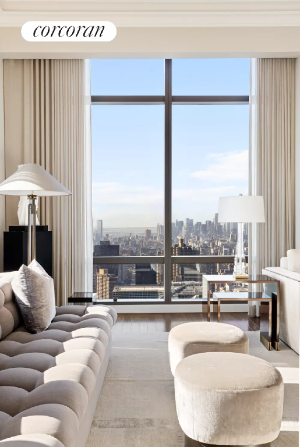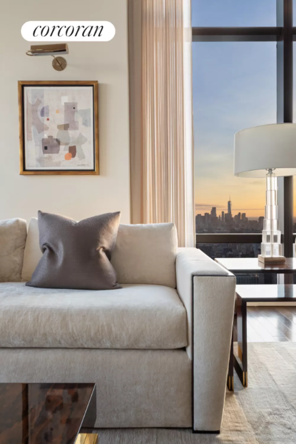 The corner living area with the most dramatic New York city and water view, showcases custom engraved drapery and shade controls, ensuring that your privacy and comfort are always at your fingertips. Custom-crafted furniture graces every nook, epitomizing the pinnacle of luxurious living. Handwoven Tibetan rugs imbue warmth and texture into the floors, transforming each step into a sumptuous experience.