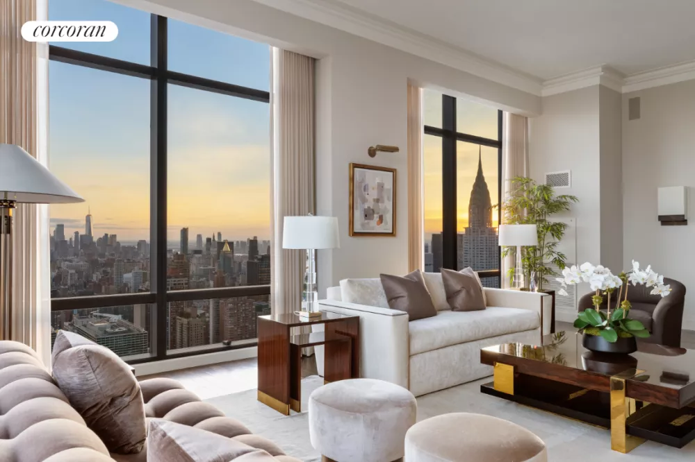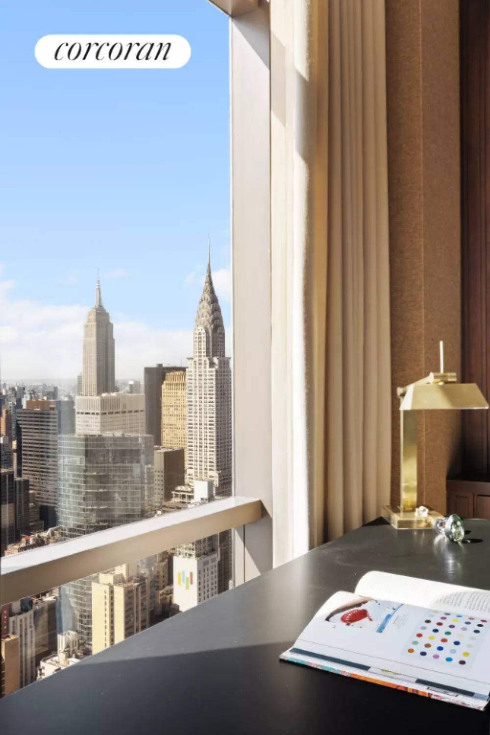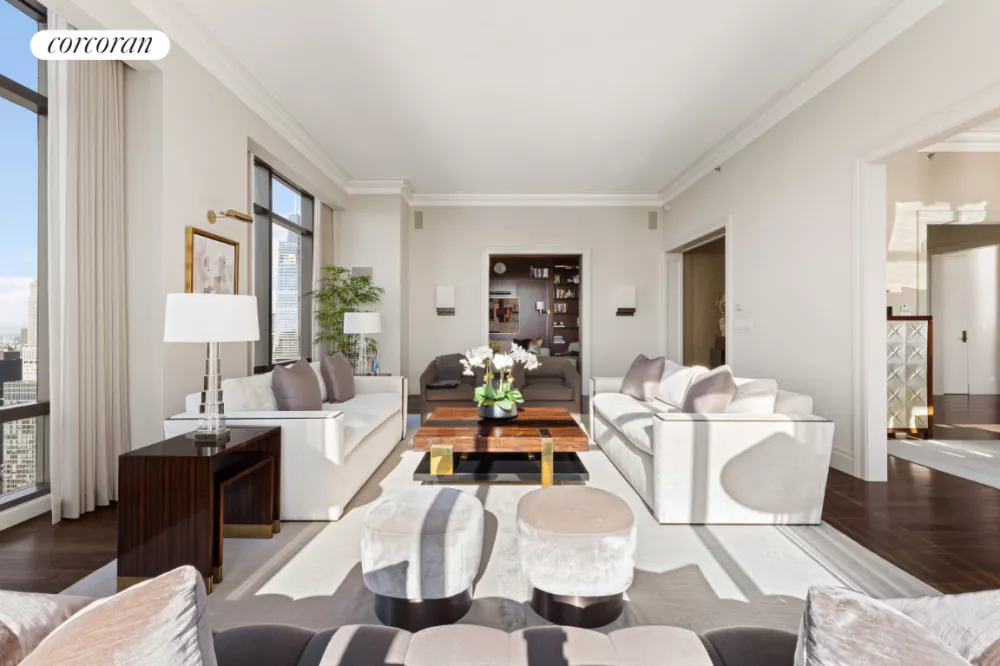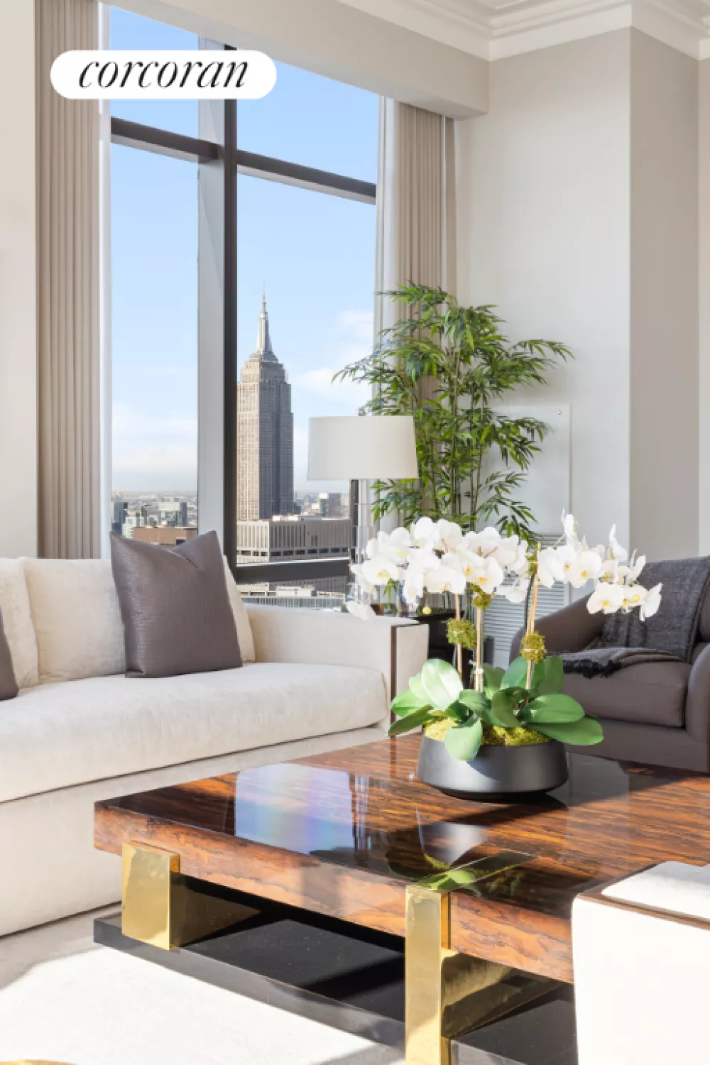 The corner living area with the most dramatic New York city and water view, showcases custom engraved drapery and shade controls, ensuring that your privacy and comfort are always at your fingertips. Custom-crafted furniture graces every nook, epitomizing the pinnacle of luxurious living. Handwoven Tibetan rugs imbue warmth and texture into the floors, transforming each step into a sumptuous experience.