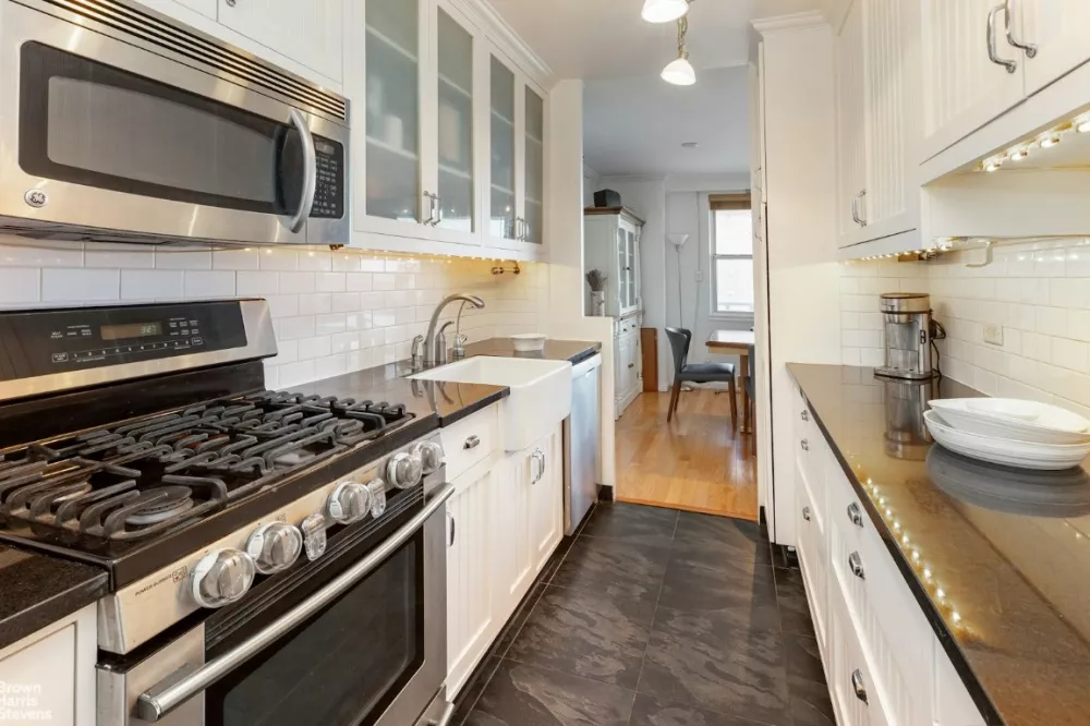 This beautifully maintained, renovated apartment features a large living room with a generous dining area. The large galley tiled kitchen boasts stainless steel appliances, a huge farmer's sink, stone countertops, ample cabinetry, and subway tiled backsplash. The primary bedroom is oversized with 2 large closets and 3 windows offering double exposures, easily accommodating a king-size bed. The second bedroom is generous with a double window. The renovated, modern windowed bathroom is fully tiled.