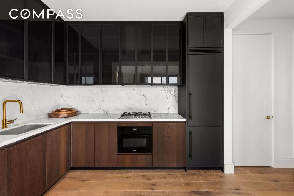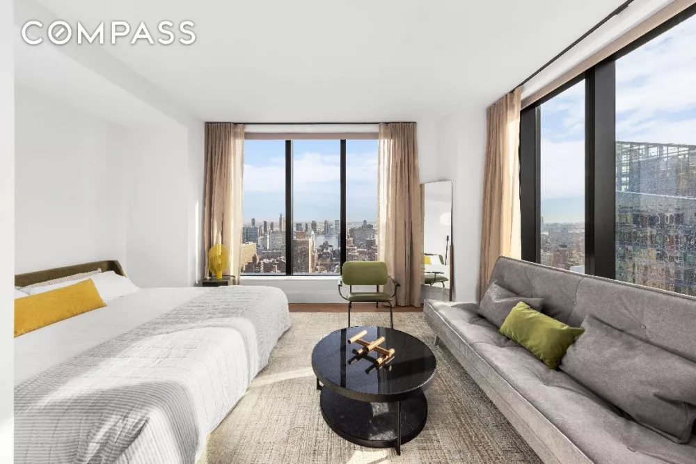 Inside this beautifully arranged residence, 11-foot-tall ceilings soar above rusticated hardwood floors while 9-foot-tall windows frame postcard views and glorious natural light to the south and east. A gracious entry with a roomy coat closet ushers you into the corner living space where vistas stretch to the East River and the New York Life building’s iconic gold crown. Enjoy a generous footprint for seating and sleeping areas while the open eat-in kitchen impresses with custom walnut and glass cabinetry and honed Calacatta marble countertops. The upscale Miele appliance package includes a cooktop, oven, refrigerator and dishwasher. Unwind in the stunning spa bathroom where floor-to-ceiling designer tile surrounds a walk-in glass rain shower and contemporary vanity, all adorned with brass hardware. A wide clothes closet and an in-unit washer-dryer complete this magnificent sanctuary in the sky.