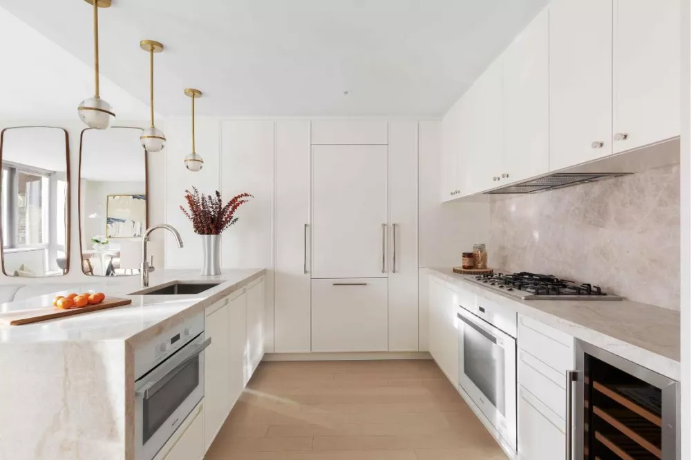 This south-facing, sun-filled, 992 square-foot, 2-bedroom, 2-bathroom opens onto 5 plank white oak flooring bathed in natural light from oversized south-facing windows. The custom CetraRuddy-designed eat-in kitchen is outfitted with white matte lacquer cabinetry, a full suite of Miele appliances, and... See more