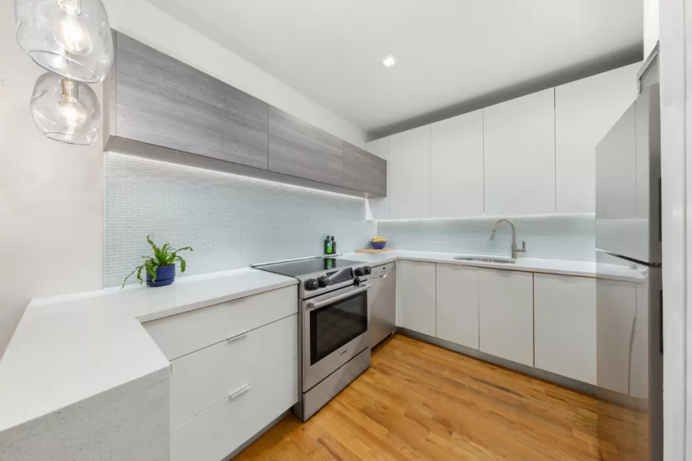 The modern open kitchen features sleek white and grey cabinetry, upscale stainless steel appliances, engineered stone countertops and under cabinet lighting. The baths are adorned with a variety of stylish contemporary stone tiles, cabinetry and polished chrome fixtures. The primary bath features a shower/tub combo, while the secondary bath is equipped with a walk in shower.