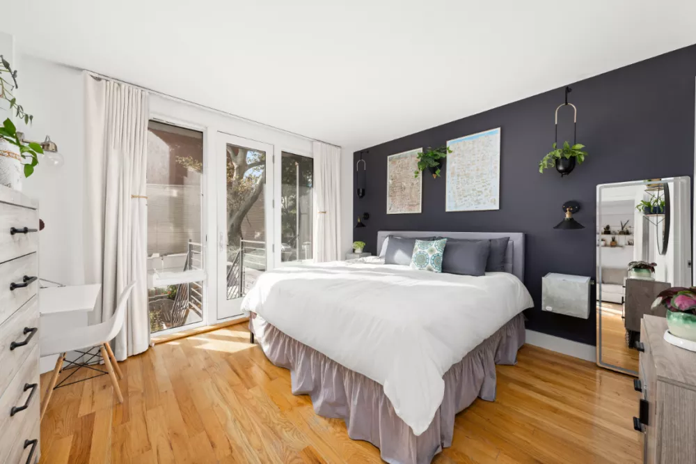 The spacious primary bedroom is smartly outfitted with a custom built closet, ensuite bathroom and access out to the private back yard. The second bedroom has access to the covered terrace and is enhanced with exceptionally deep dual closets.