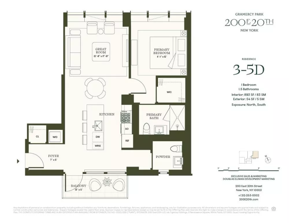 This premier one-bedroom, one-and-a-half bath residence is a true trophy for its floor-through flow and its beautiful glass-enclosed, south-facing terrace. With both northern and southern exposures, this home is bathed in natural light, further enhanced by its panoramic windows, 9'8 ceilings, and Italian White Oak wide-plank flooring. The terrace offers a rare opportunity to enjoy seamless indoor-outdoor living, making it the centerpiece of this luxurious residence. The VRF heating and cooling system ensures personalized comfort. Laundry closets, equipped with Miele washer and dryer, add convenience. Elegant neutrals pervade the Primary Bath palette. A custom Tambour fluted wood-veneer vanity with blackened steel-frame mirrored medicine cabinet create pleasing shapes and lightly rendered lines that are in keeping with building's tightly tailored aesthetic. A study in subtlety, the Powder Room walls are covered in grey Xtone Fiori di Bosco large format sintered polished marble tiles. The moody shade of the custom Grafite honed marble stone slab vanity completes the composition.