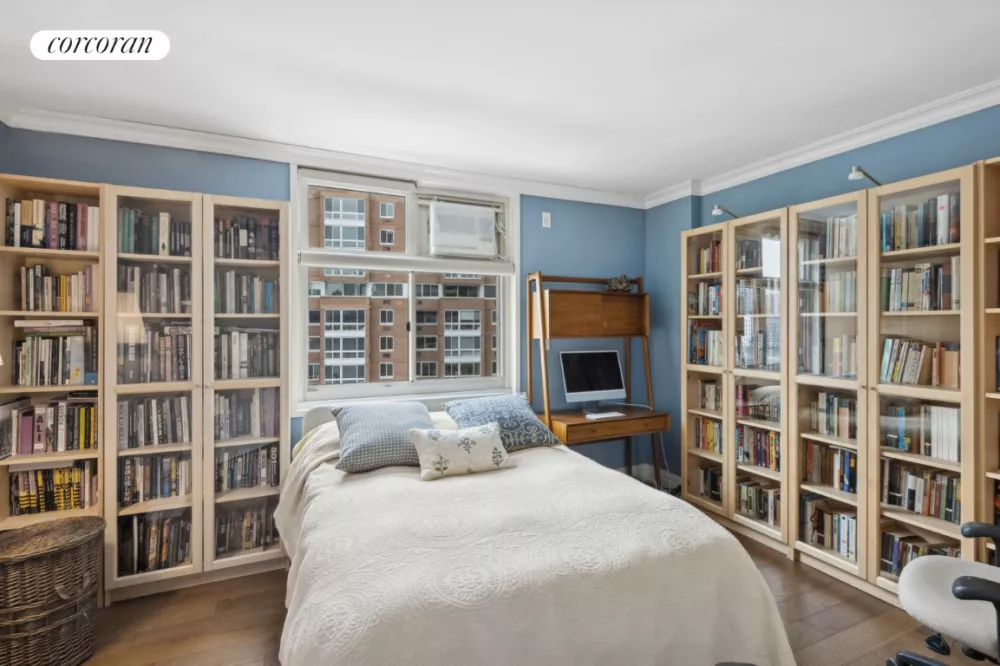 The second bedroom is equally inviting, offering space for a queen bed, built-in bookshelves, and a dedicated workspace-perfect for a home office or guest room. A fully built-out closet maximizes storage, and the conveniently located full guest bath ensures ultimate comfort.