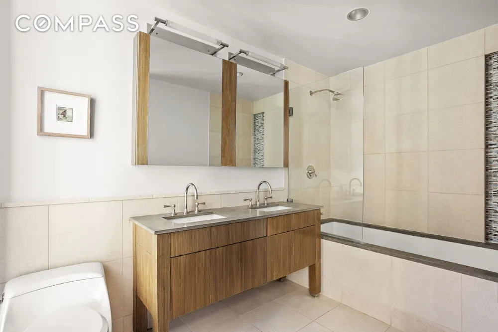 The Primary bathroom has a soaking tub, double sink vanity and amazing views of the Empire state building-