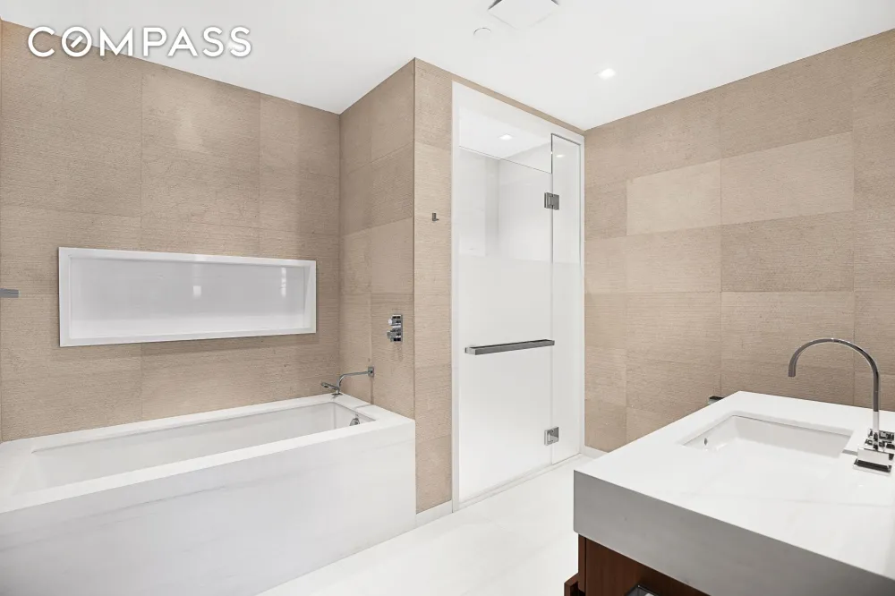 Retreat to the luxurious primary bedroom with an ensuite marble bathroom with a soaking tub and separate shower, providing a serene spa escape. This bathroom features a heated Bianco Dolomiti marble floors, brushed limestone walls and a marble slab countertop adorn the tranquil four-fixture primary bathroom. Recessed medicine cabinets w/ LED lighting, a Zuma soaking tub, a glass-enclosed shower, and Dornbracht fixtures add to the resort-inspired experience. The gorgeous powder room features a Calacatta Fabricotti custom stone vanity with a carved stone sink, bronze accents, and an Eramosa marble floor and accent wall in a herringbone pattern inlay. This residence offers ample storage with a large California custom walk-in closet.