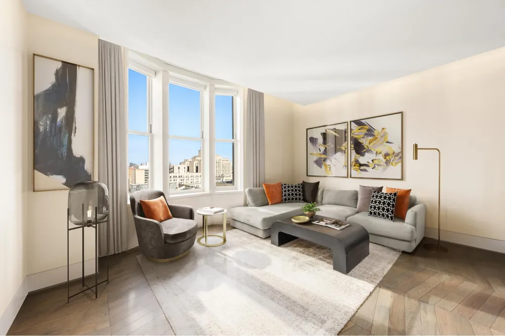 The primary bedroom suite is both elegant and spacious, with an oversized bay window, high ceilings, and ample closet space. The primary bath features soft cove lighting, honed white marble, custom Apaiser stone double vanities, illuminated mirrors, and radiant heat floors. The second bedroom, bathed in natural light, offers three large windows with views of the historic Manhattan Municipal Building. The secondary bath is equally impressive, featuring honed Casona Pietra Forte Forentina Sandstone tiles, a custom Apaiser stone vanity, and brushed Nickel Waterworks fixtures. A full-size washer and dryer add convenience to this already exceptional space.