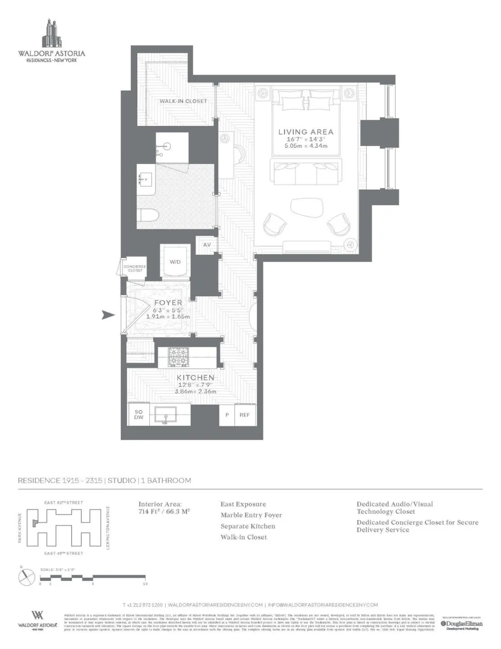 Own a piece of the legacy at Waldorf Astoria Residences New York. Residence 1915 a gracious studio with eastern exposure, overlooking a landscaped terrace. The 714 SF home offers a large walk-in-closet and separate kitchen.