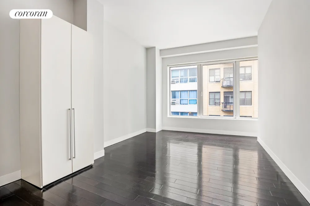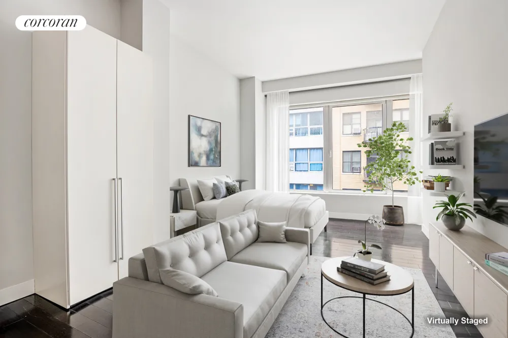Welcome home to this lovely modern studio apartment at 111 Fulton Street in the heart of the Financial District. Unit 822 offers loft-style living with 11'4" high ceilings, and features rich dark stained wood floors, and an enormous wall of South-facing windows with easy electric blinds built-in for privacy.