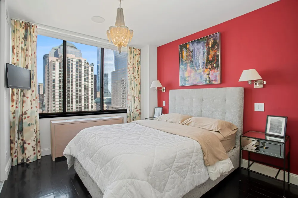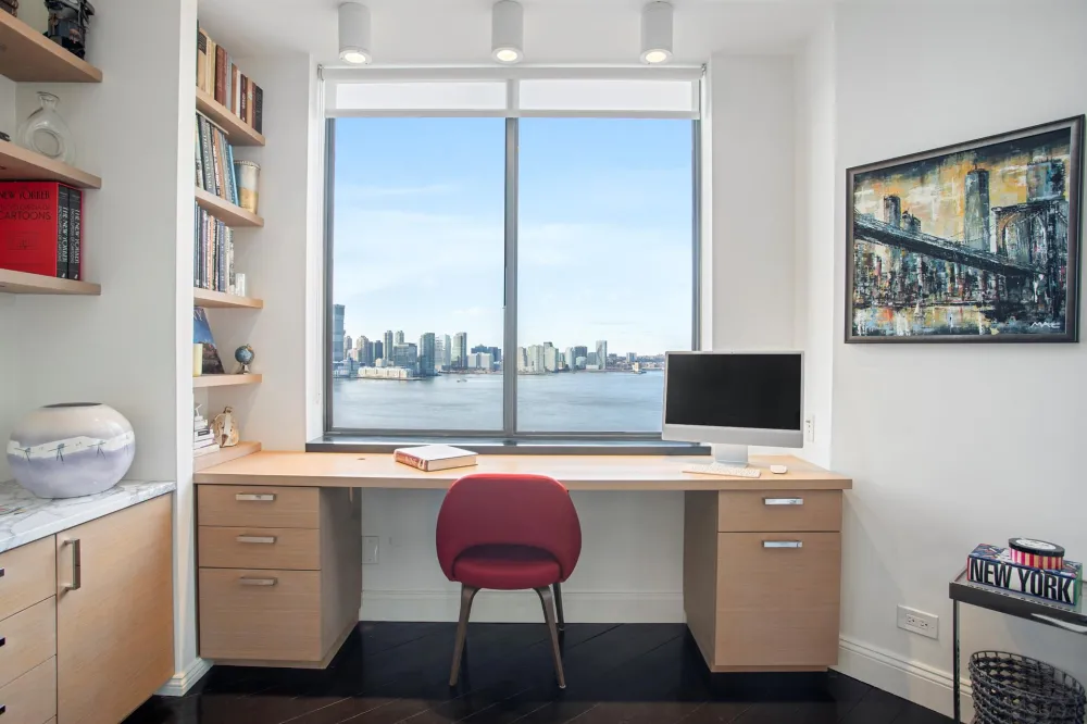 In a word MAGNIFICENT! Open Panoramic River and City Views from all rooms, move in ready! Amazing custom design touches. Welcome to 380 Rector, which sits right on the Promenade next to the Hudson River. Perched high above the Hudson River lies an Oasis of calm in this spectacular one bedroom one bath home. This is a one of a kind B line, in that the renovation flipped the bedroom and living room, to enhance views and space. You enter into this extraordinary home with dark stained 2 inch wide plank hardwood floors. The living room has two exposures hard to say which one is better, north and west views of the Hudson, New Jersey and up river as far as your eyes can see. The living room has a ton of tasteful and wonderful storage all custom-made by Jim Campo, Customwood. The kitchen is equally ready for you to welcome your "inner chef" with custom made kitchen cabinets, stainless appliances throughout, stove, dishwasher fridge and microwave along with a 30-40 bottle wine refrigerator and accented with beautiful Arabescato Marble counter tops. The bathroom is appointed with a stall shower and marble tiles throughout. Last; The Bedroom, which has an amazing angled north exposure, so you can enjoy both River views and the Freedom Tower and downtown Manhattan views. Incredible closets and storage (California Closets) throughout this gem of a home. Full service doorman building with live-in Resident Manager. Liberty Terrace is an oasis in Battery Park City and close to transportation, restaurants and shopping. FURNITURE: Bob Gold/Mitchell Williams couches/tables and Knoll Saarinen chair. The drapes were also custom made. Note: Furniture can be part of the sale. Run don't walk! You really don't want to miss this apartment! Pieds a terre welcome.