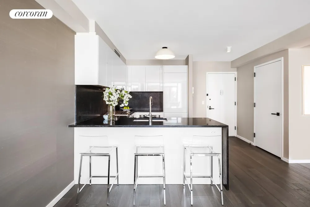 Residence 8F is a graciously proportioned east-facing apartment with views to the East River through oversized windows and a sunlit living room. Light-filled interiors by renowned D'Apostrophe Design showcase thoughtful layouts with a modern feel. A considered collection of materials including European 5 wide plank wood flooring, custom glossy white lacquer kitchen cabinetry, and distinct selections of stone create stylish comfortable residences. The apartment features an open kitchen with Honed Petite Granite marble countertops and backsplash. Among its top-of-the-line appliances are a Sub-Zero refrigerator, a Bosch cooktop, oven and dishwasher. The master bedroom provides plenty of furnishing options as well as custom-built walk-in closet. The bathroom is fitted with Waterworks fixtures and fittings, Toto water closet, Vanity finished in ash wood finish with blackened steel frame, Silver grey porcelain tile walls and Honed Grey Fume marble flooring. A GE washer and vented dryer complete the apartment.